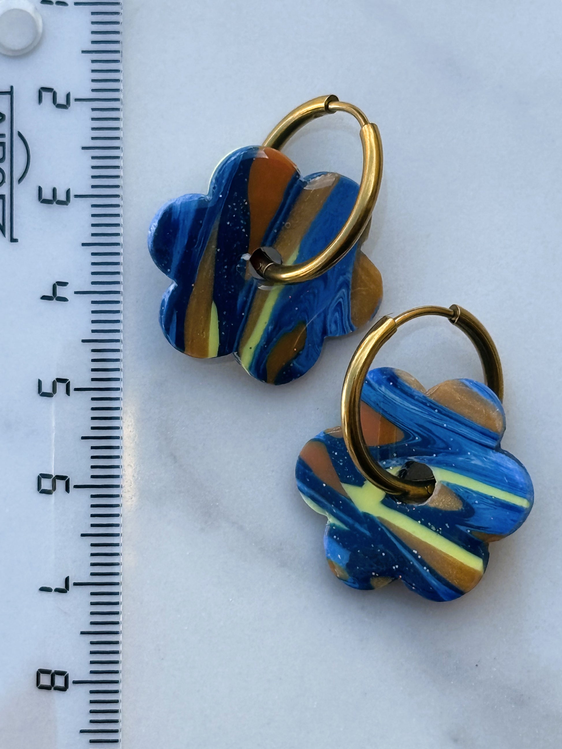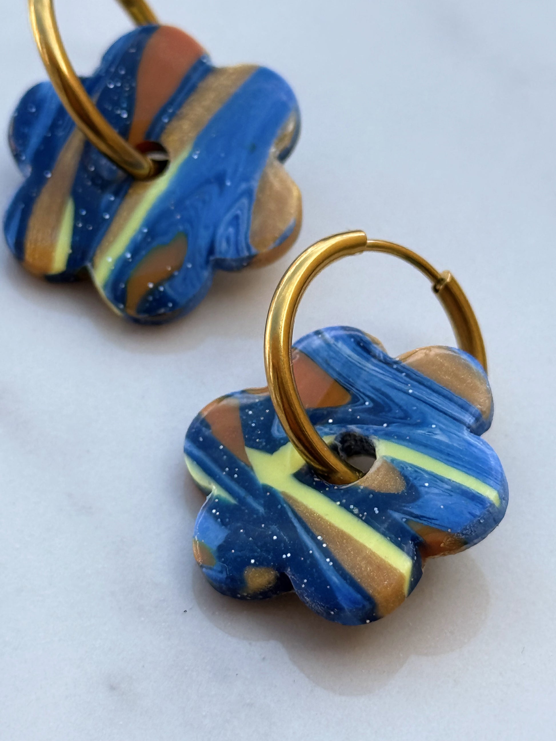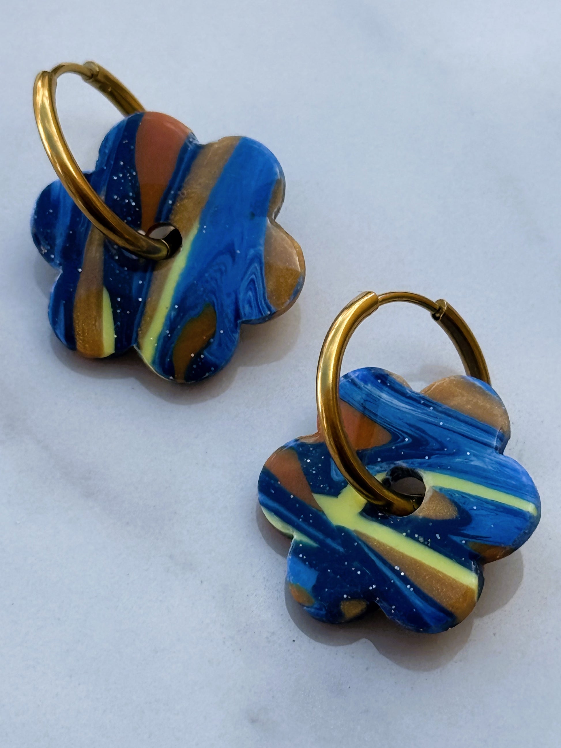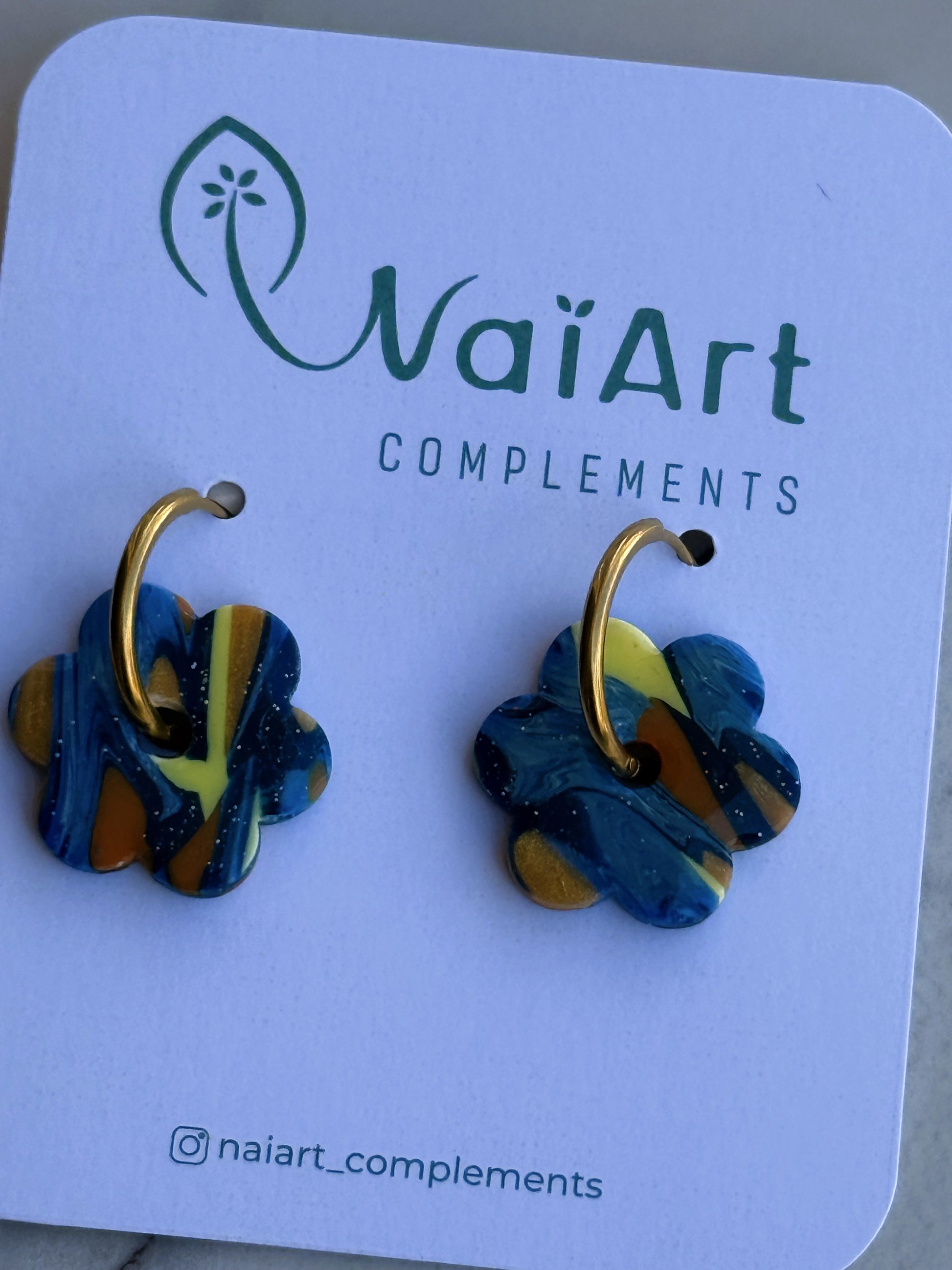 Arracades en forma de cercle amb tons blaus, daurats i grocs, que recorden els jocs de llum i color del mediterrani.